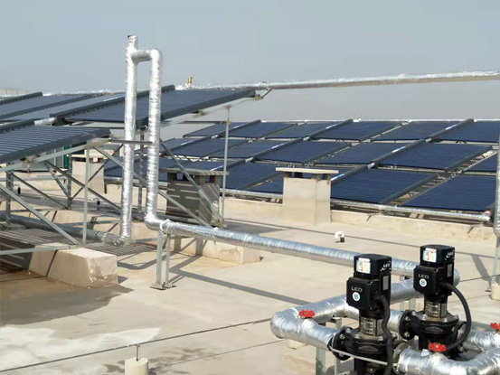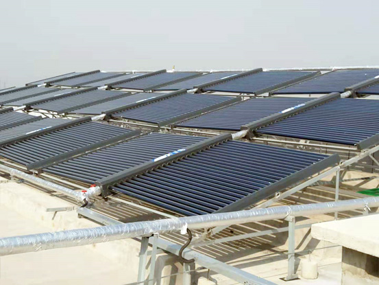 此太阳能热水系统,采用格瑞德高效全玻璃真空管集热器,总集热面积210平方米,集热水箱1,个恒温水箱1个,恒温水箱和电热水炉结合形成光电互补的形式,保持热水恒温,提供24小时不间断热水,集热水箱提供预热供水,供给恒温水箱。系统全自动运行,具有防冻、房炸管、高温保护、自动补水、恒温恒压供水等功能。