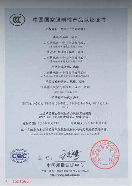grad山东格瑞德集团低环境温度空气源热泵(冷水)机组荣获CCC认证证书
