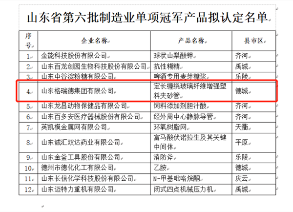 近日,山东省工信厅公示了第六批省制造业单项冠军拟认定名单和第三批复核拟通过名单,集团定长缠绕玻璃纤维增强塑料夹砂管产品上榜山东省制造业单项冠军产品拟认定名单。