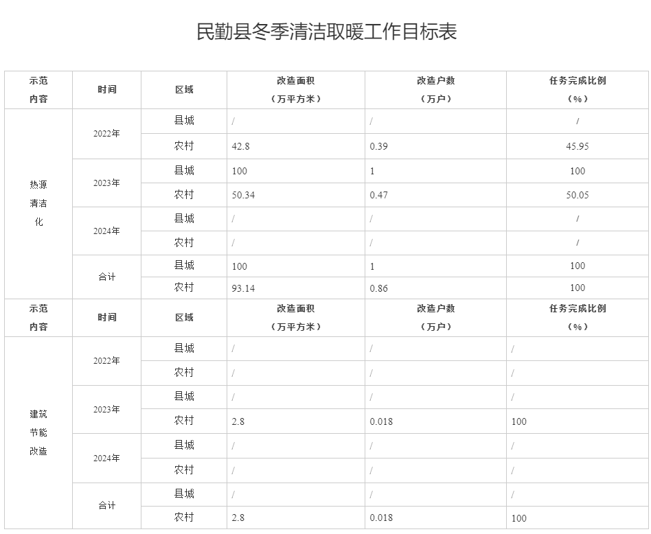 根据方案内容显示,2022—2024年度,全县实施热源清洁化和既有建筑节能改造195.94万平方米,惠及城乡居民1.88万户,实施项目10项,总投资4.27亿元。其中:热源清洁化方面,县城改造100万平方米、1万户,农村改造93.14万平方米、0.86万户;既有建筑节能改造方面,农村改造2.8万平方米、0.02万户。改造后,县城清洁取暖率达到100%,县城既有建筑节能改造率达到90.4%。环境空气质量持续改善,完成省上下达的环境空气质量改善目标。