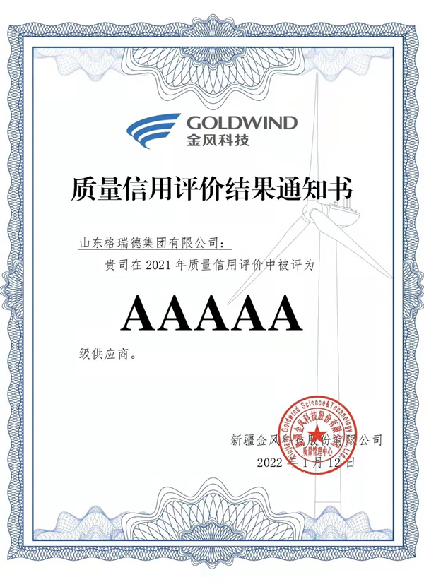 格瑞德荣获金风科技“5A级供应商”殊荣