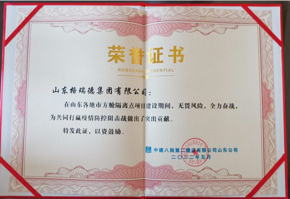 格瑞德集团临危受命,先后承揽临沂市罗庄区、莒南县、河东区隔离病房通风及过滤设备生产任务,由格瑞德集团生产的183台高效低噪音斜流风机、2台防爆斜流风机、144台净化空调器仅用5天时间完成生产工作。格瑞德集团高效、高速、高质量的技术品质荣获甲方客户授予“疫情防控阻击战先进单位”称号。