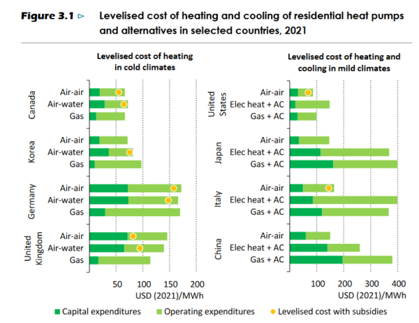 国际能源署数据显示,在美国、加拿大、日本、意大利和中国等国家,无补贴的热泵已经比燃气锅炉更具成本竞争力。但是,在英国和德国等市场上,热泵仍需依靠补贴才具有成本竞争优势。