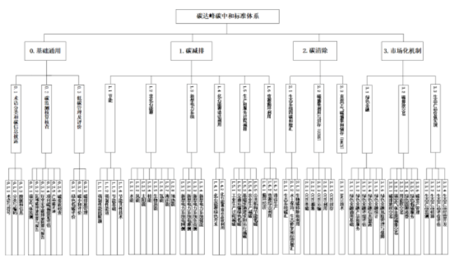 碳达峰碳中和标准体系包括基础通用标准子体系、碳减排标准子体系、碳清除标准子体系和市场化机制标准子体系等4个一级子体系,并进一步细分为15个二级子体系、63个三级子体系。该体系覆盖能源、工业、交通运输、城乡建设、水利、农业农村、林业草原、金融、公共机构、居民生活等重点行业和领域碳达峰碳中和工作,满足地区、行业、园区、组织等各类场景的应用。本标准体系根据发展需要进行动态调整。
