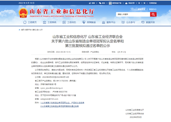 9月,山东省工信厅公示了第六批省制造业单项冠军拟认定名单和第三批复核拟通过名单,集团定长缠绕玻璃纤维增强塑料夹砂管产品上榜山东省制造业单项冠军产品拟认定名单。