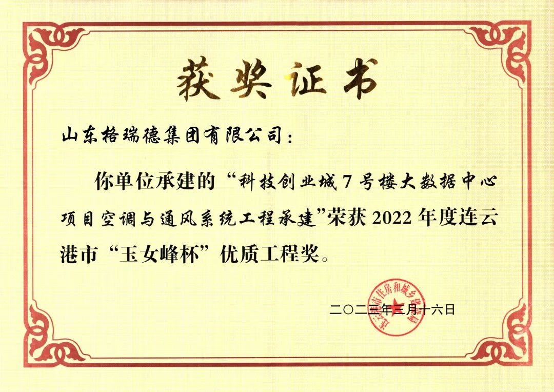 近日,格瑞德集团签订的“科技创业城7号楼大数据中心项目空调与通风系统”项目,荣获连云港市“玉女峰杯”优质工程奖。