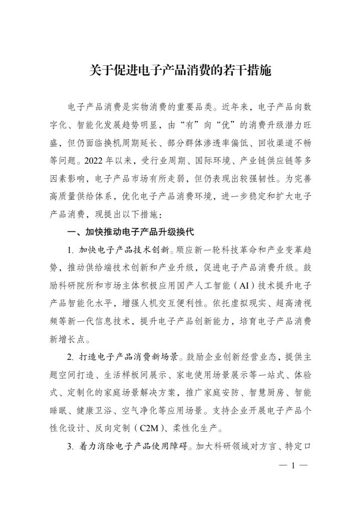 7月21日,国家发改委等部门印发《关于促进电子产品消费的若干措施》,措施中提到,为有效促进电子产品消费,助力消费恢复和扩大。持续推动家电下乡。有条件的地区可对绿色智能家电下乡、家电以旧换新等予以适当补贴,按照产品能效、水效等予以差异化政策支持。有序推进农村地区清洁取暖,提升农村用能电气化水平和可再生能源比重。因地制宜支持环保灶具、空气源热泵、燃气壁挂炉、太阳能热水器、家用储能设备等绿色节能家电推广使用。