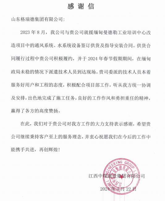 近日,江西中煤建设集团有限公司向格瑞德集团发来表扬信,对公司在援缅甸曼德勒工业培训中心改造项目中所展现出的专业素养和高效服务给予高度评价。