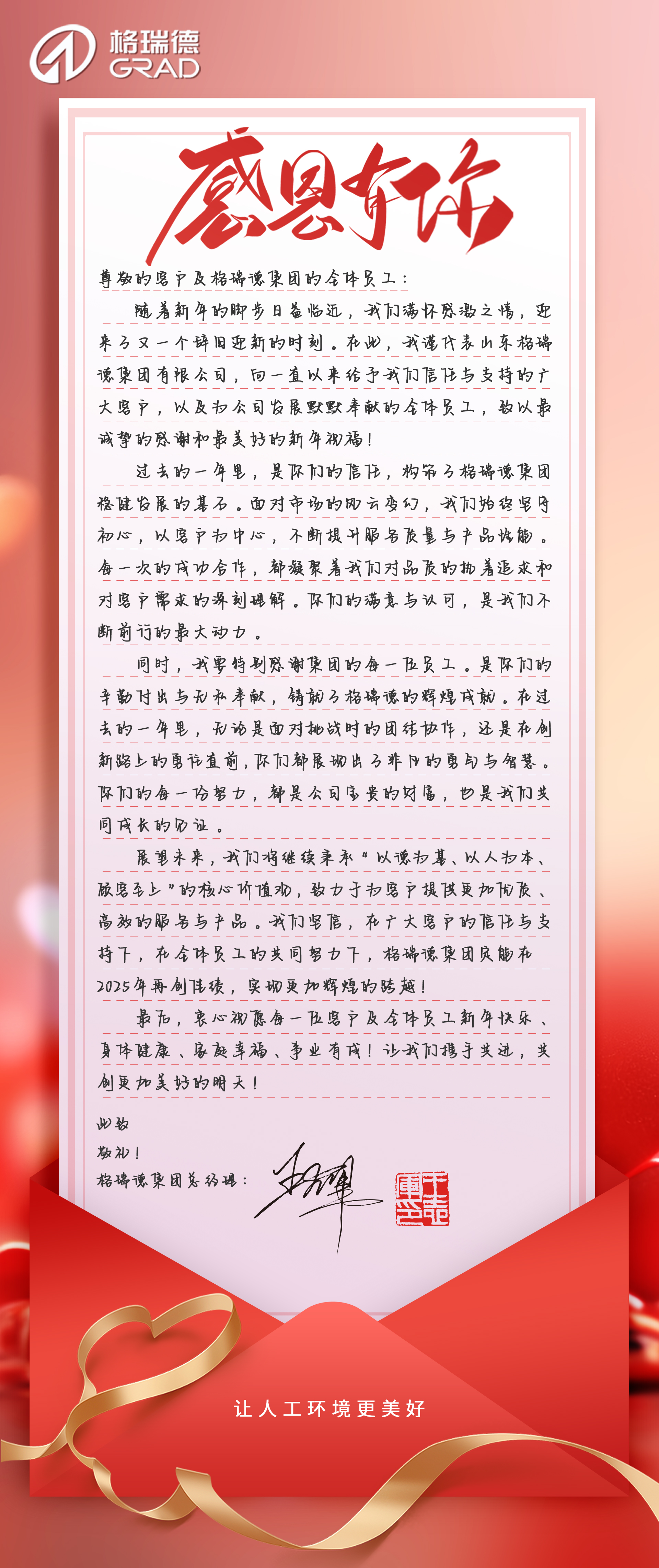 过去的一年里,是你们的信任,构筑了格瑞德集团稳健发展的基石。面对市场的风云变幻,我们始终坚守初心,以客户为中心,不断提升服务质量与产品性能。每一次的成功合作,都凝聚着我们对品质的执着追求和对客户需求的深刻理解。你们的满意与认可,是我们不断前行的最大动力。