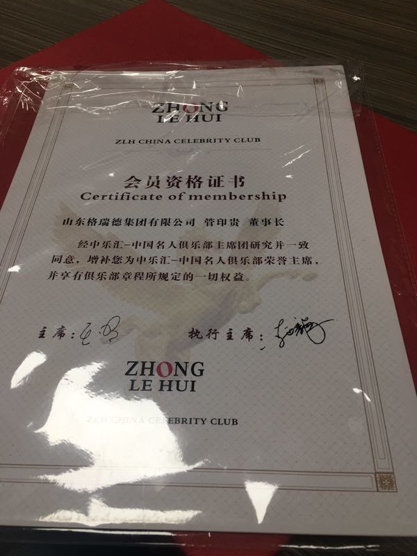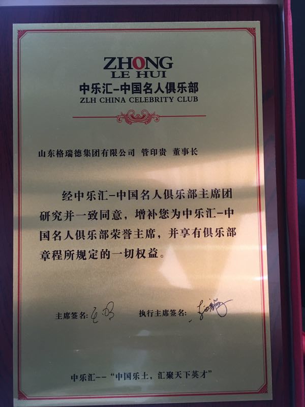 管印贵董事长被中乐汇·中国名人俱乐部授予“荣誉主席”的职位。